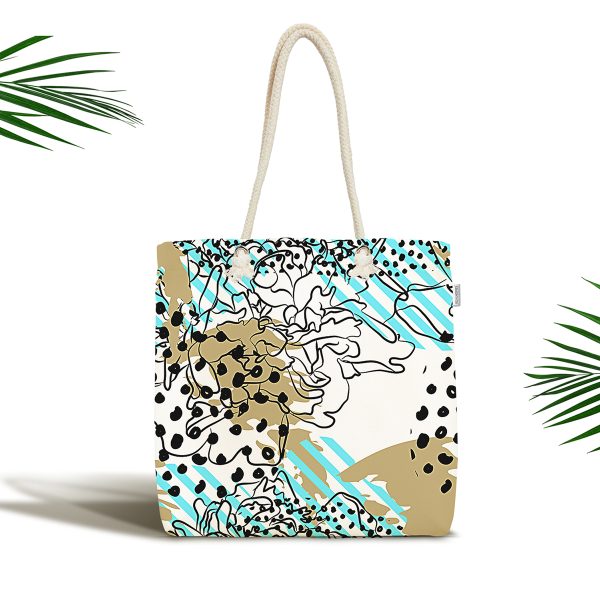 Beyaz Zeminde Onedraw Çizimli Yaprak Desenli Dijital Baskılı Kumaş Plaj Çantası