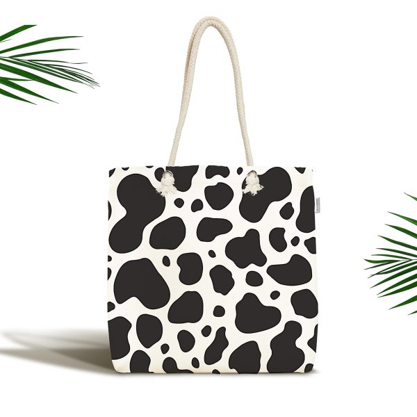 Beyaz Zeminde Siyah Renkli Geyik Desenli Dijital Baskılı Kumaş Plaj Çantası