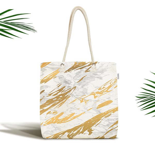 Gri Beyaz Zemin Üzerinde Gold Detaylı Çizim Desenli Dijital Baskılı Kumaş Plaj Çantası