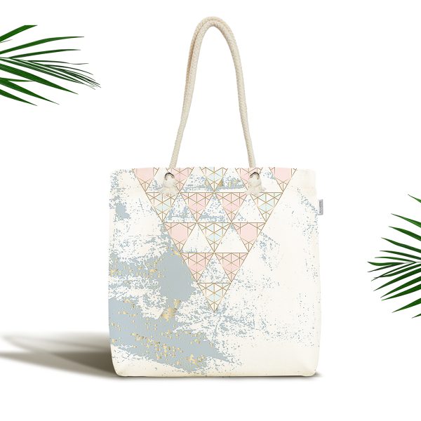Renkli Zemin Üzerinde Üçgen Desenli Dijital Baskılı Kumaş Plaj Çantası