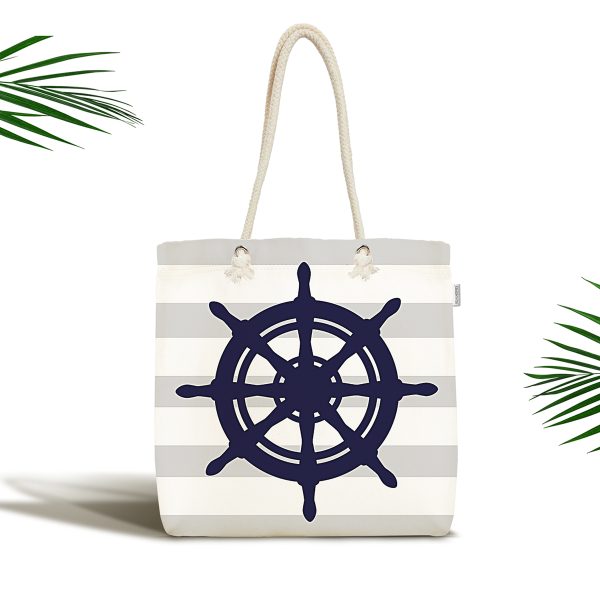 Gri Beyaz Çizgili Çapa Desenli Dijital Baskılı Kumaş Plaj Çantası