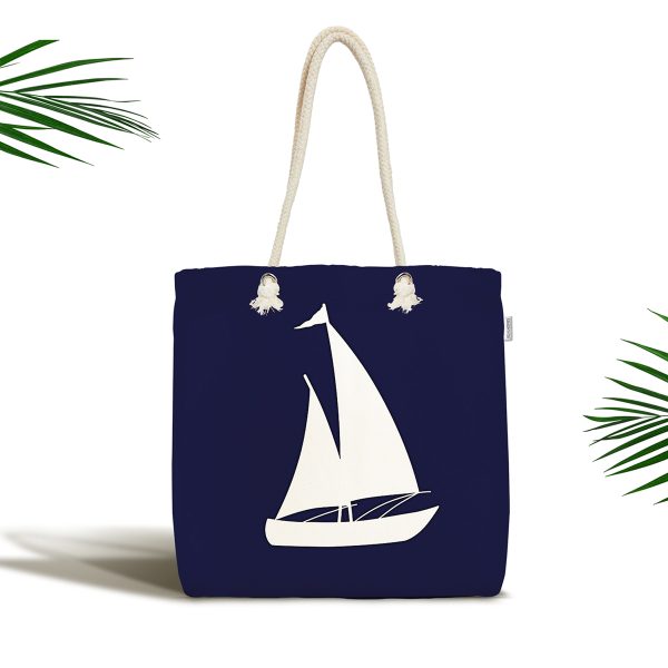 Lacivert Zeminli Yelken Desenli Dijital Baskılı Kumaş Plaj Çantası