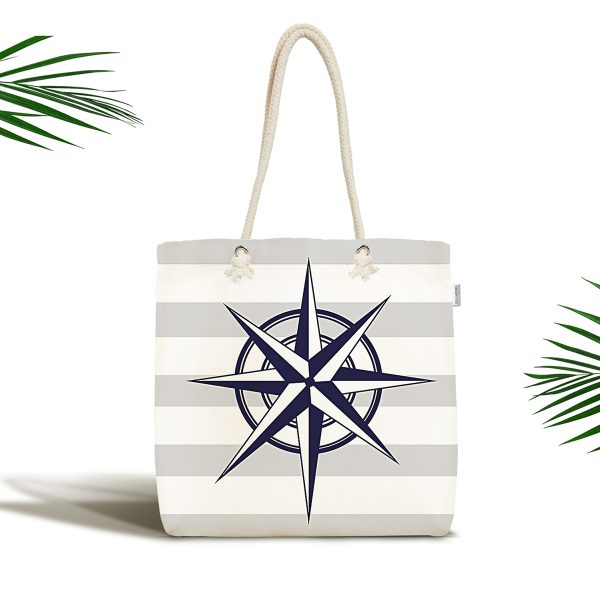Gri Beyaz Zeminde Pusula Desenli Dijital Baskılı Kumaş Plaj Çantası
