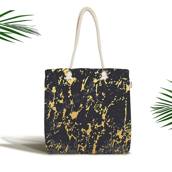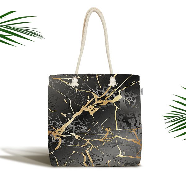 Antrasit Zemin Üzerinde Gold Detaylı Çizim Desenli Dijital Baskılı Kumaş Plaj Çantası