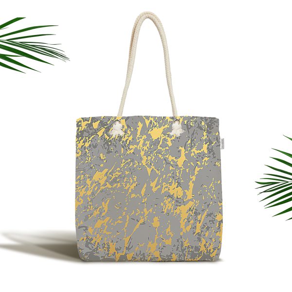 Gri Zemin Üzerinde Gold Detaylı Soft Çizim Desenli Dijital Baskılı Kumaş Plaj Çantası