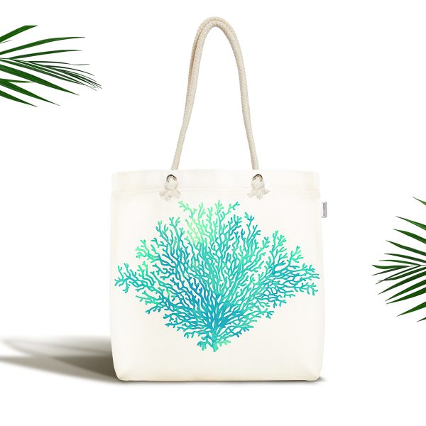 Beyaz Zeminde Yeşil Renkli Su Yosunu Desenli Dijital Baskılı Kumaş Plaj Çantası