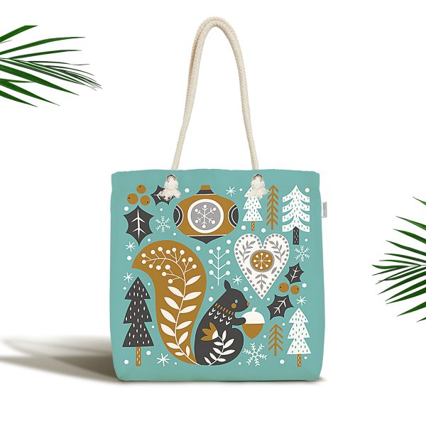 Renkli Zeminde Sincap Desenli Dijital Baskılı Kumaş Plaj Çantası