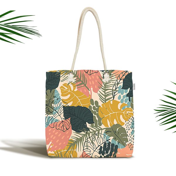 Soft Renkli Zemin Üzerinde Koyu Renkli Yaprak Desenli Dijital Baskılı Kumaş Plaj Çantası