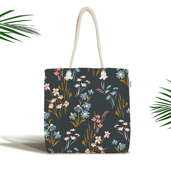 Siyah Zemin Üzerinde Rengarenk Çiçek Desenli Dijital Baskılı Kumaş Plaj Çantası