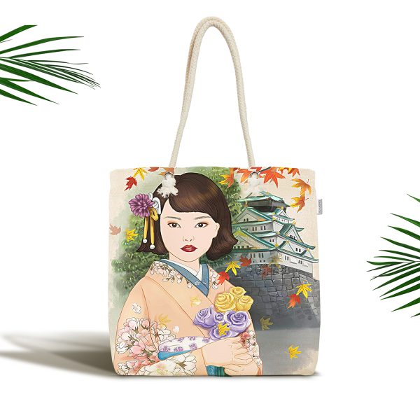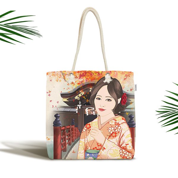 Geleneksel Kıyafetli Japon Kadın Figürü Dijital Baskılı Özel Tasarım Kumaş Plaj Çantası