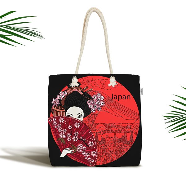 Geleneksel Japon Kadın Figürü Dijital Baskılı Özel Tasarım Kumaş Plaj Çantası