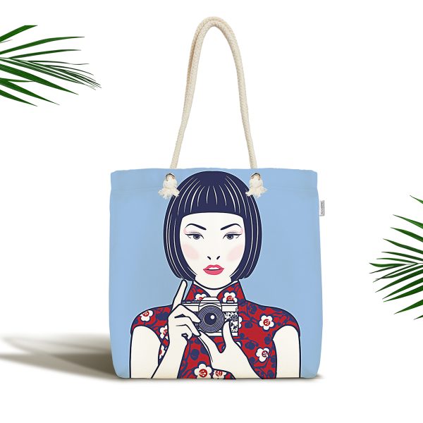 Fotoğraf Çeken Japon Kız Motifli Kumaş Plaj Çantası