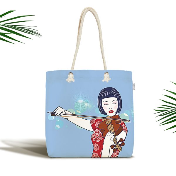 Mavi Zeminde Keman Çalan Japon Kız Desenli Kumaş Plaj Çantası