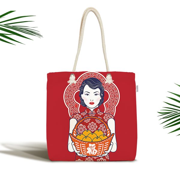 Kırmızı Temalı Japon Kadın Motifli Kumaş Plaj Çantası