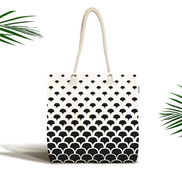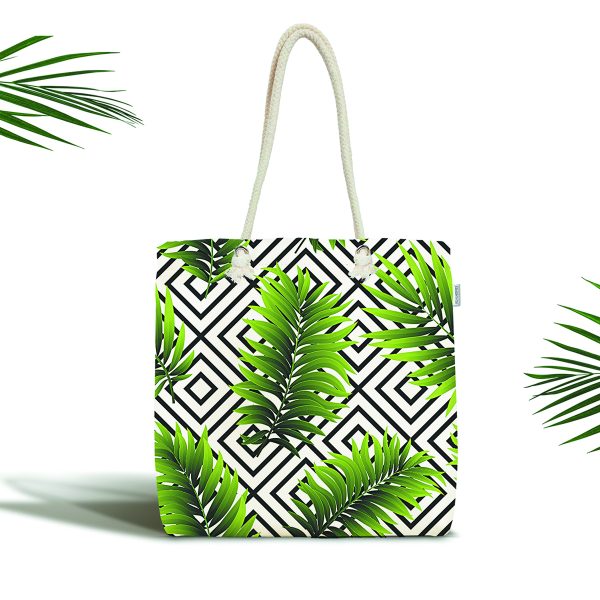 Siyah Beyaz Geometrik Zeminli Tropik Yaprak Motifli Kumaş Plaj Çantası