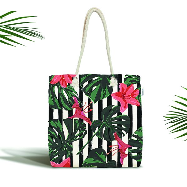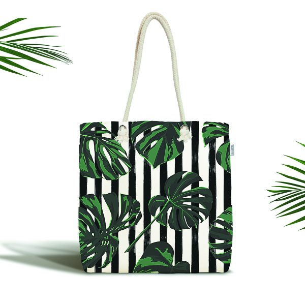 Siyah Beyaz Çizgili Tropik Yaprak Tasarımlı Kumaş Plaj Çantası