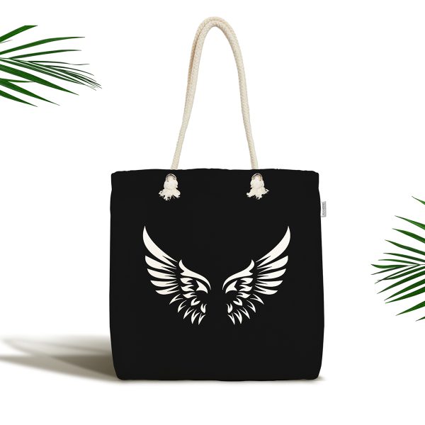 Siyah Zemin İçinde Görünen Beyaz Kanatlar Kumaş Plaj Çantası