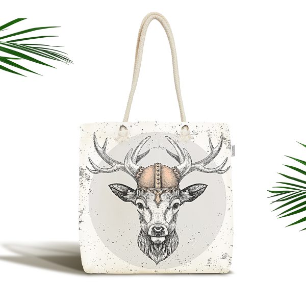Beyaz Zeminde Alageyik Motifli Modern Kumaş Plaj Çantası