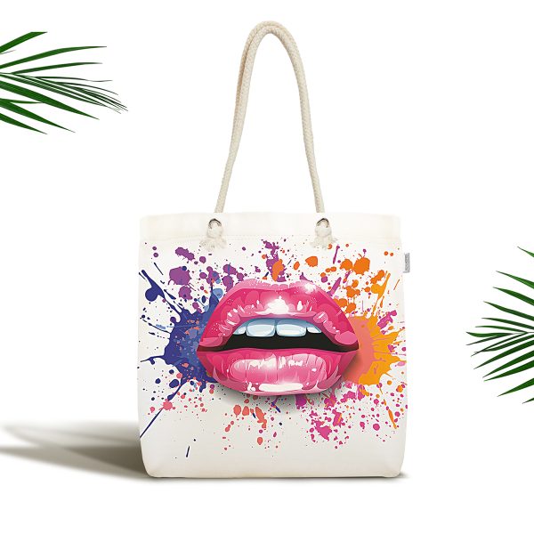 Sulu Boya Dudak Temalı Dekoratif Özel Tasarım Kumaş Plaj Çantası