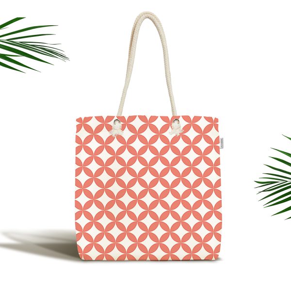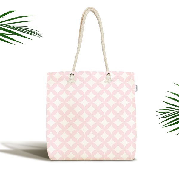 Pembe Geometrik Pul Desenli Dijital Baskılı Kumaş Plaj Çantası