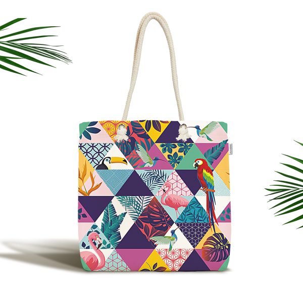 Geometrik Üçgen İçerisinde Kuş Dijital Baskılı Kumaş Plaj Çantası