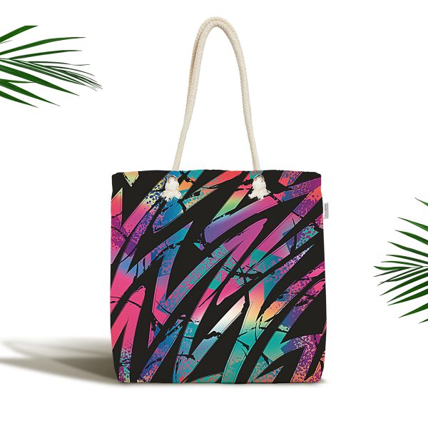 Siyah Zemin Üzerinde Neon Zikzak Desenli Kumaş Plaj Çantası