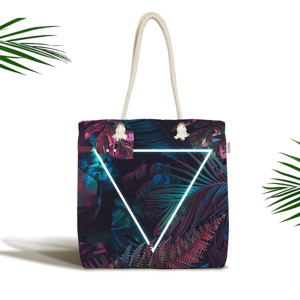 Tropik Yapraklar Üzerinde Neon Üçgen Motifli Kumaş Plaj Çantası
