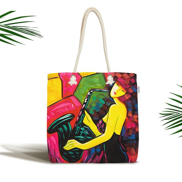 Soyut Çizim Saksafon Temalı Dijital Baskılı Kumaş Plaj Çantası