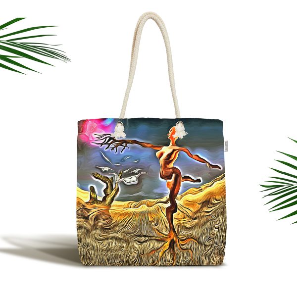 Altın Varaklı Ağaç Kadın Motifli Kumaş Plaj Çantası