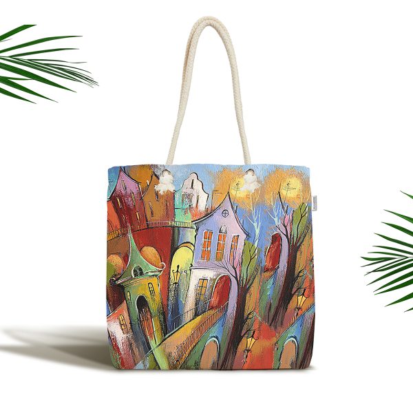 Renkli Sulu Boya Çizimli Gece Kondu Evleri Motifli Kumaş Plaj Çantası