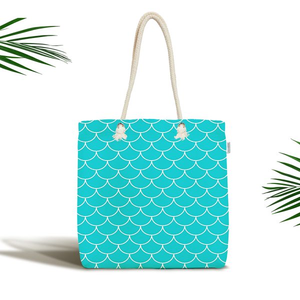 Mavi Geometrik Pul Desenli Dijital Baskılı Kumaş Plaj Çantası