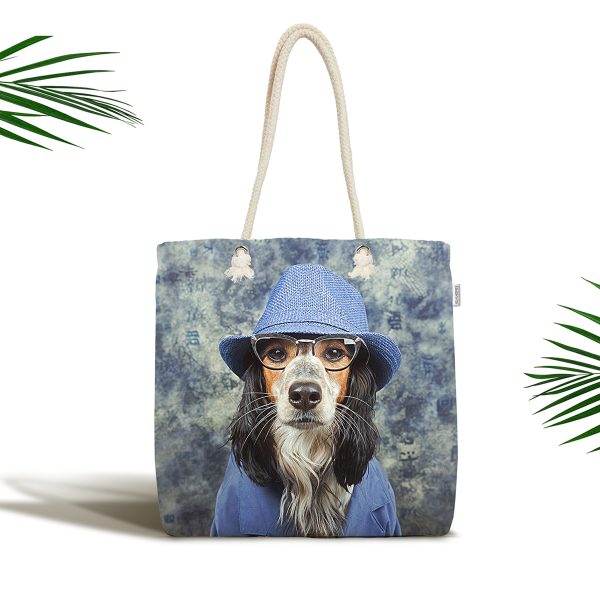 Gözlüklü Köpek Desenli Dijital Baskılı Kumaş Plaj Çantası