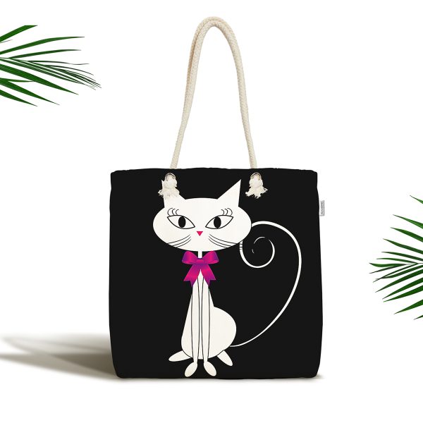 Siyah Zeminde Sevimli Beyaz Kedicik Özel Tasarımlı Kumaş Plaj Çantası