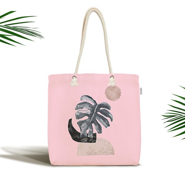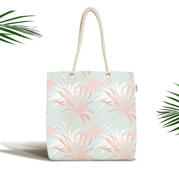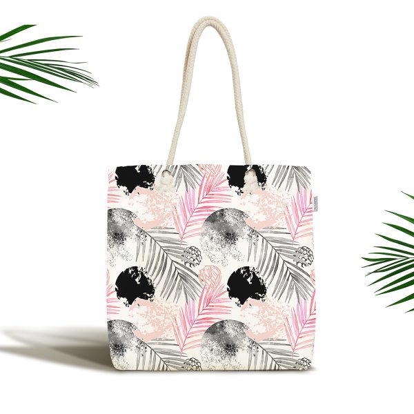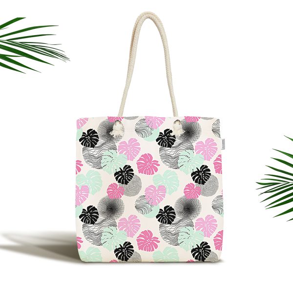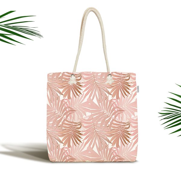 Pembe Zeminde Tropik Yaprak Desen Dijital Baskılı Özel Tasarım Kumaş Plaj Çantası