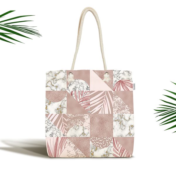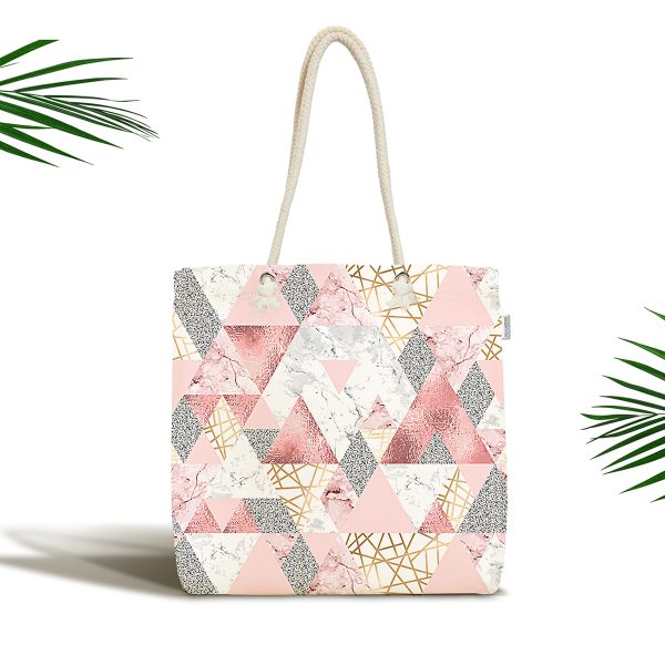 Geometrik Pembe Ve Gri Mermer Motifli Özel Tasarım Kumaş Plaj Çantası