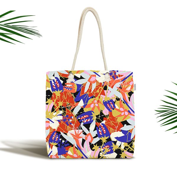 Rengarenk Yaprak Çizimli Modern Özel Tasarım Kumaş Plaj Çantası