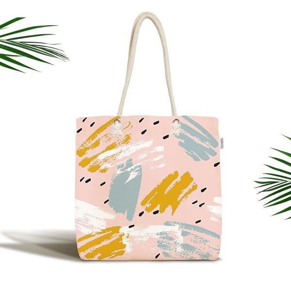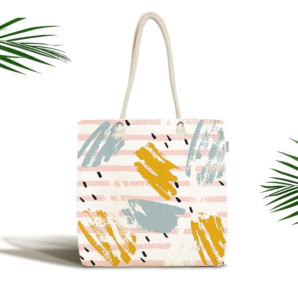 Beyaz Zeminde Sulu Boya Pembe Yan Çizgi Motifli Kumaş Plaj Çantası