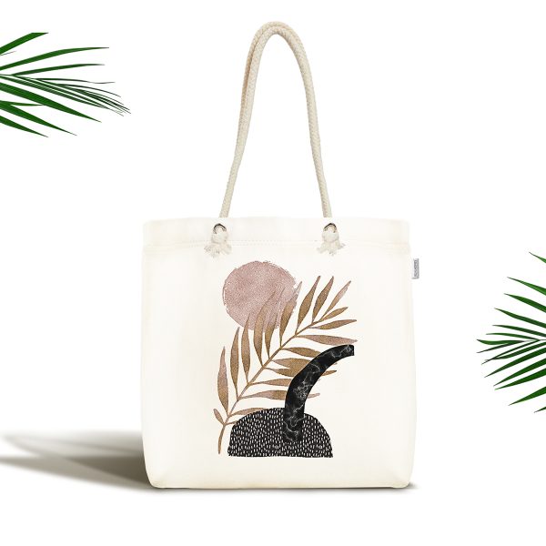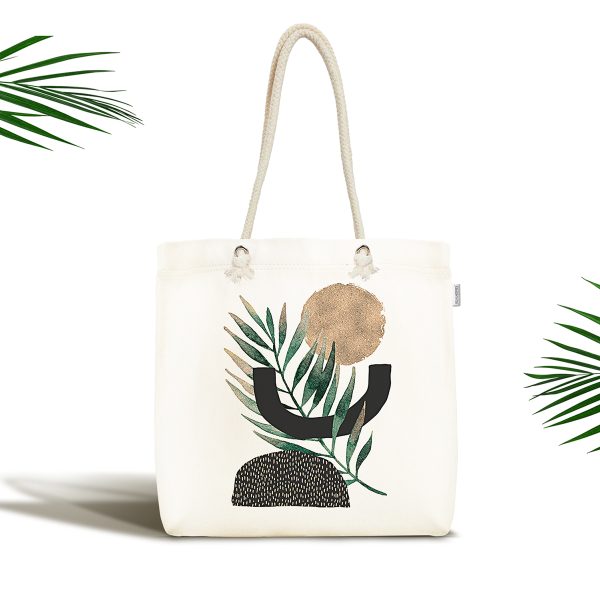 Beyaz Zemin Üzerinde Soyut Yaprak Çizimli Kumaş Plaj Çantası