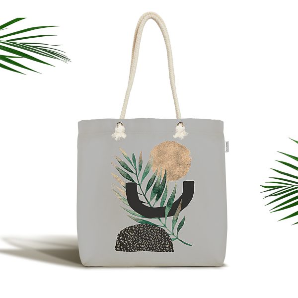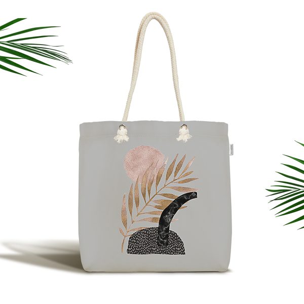 Gri Zemin Üzerinde Soyut Yaprak Çizimli Modern Özel Tasarım Kumaş Plaj Çantası