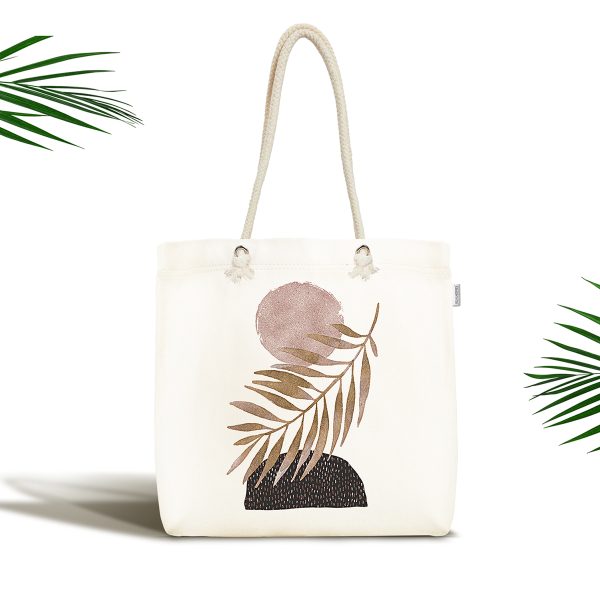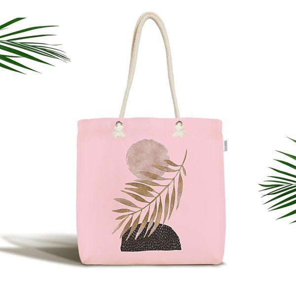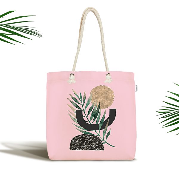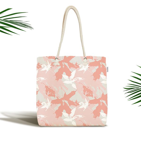 Pembe Zemin Üzerinde Soyut Yaprak Çizimli Kumaş Plaj Çantası