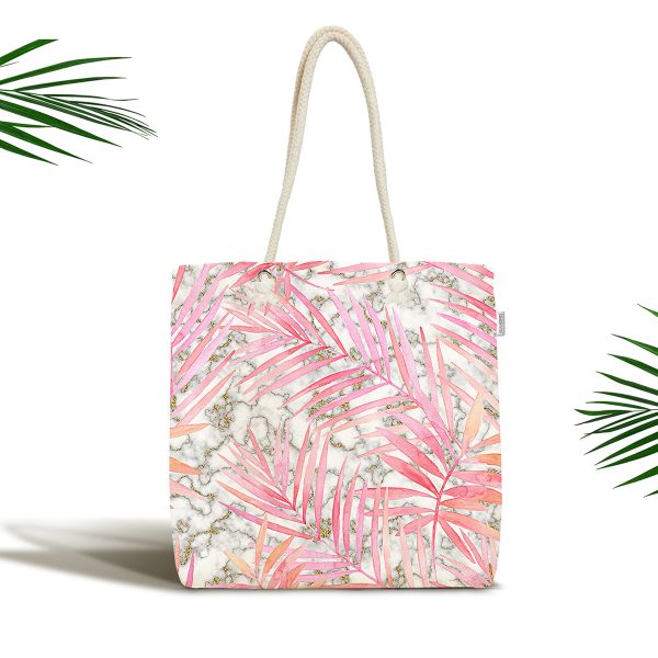 Mermer Zeminli Gold Ayrıntı Temalı Pembe Tropik Yaprak Desenli Kumaş Plaj Çantası