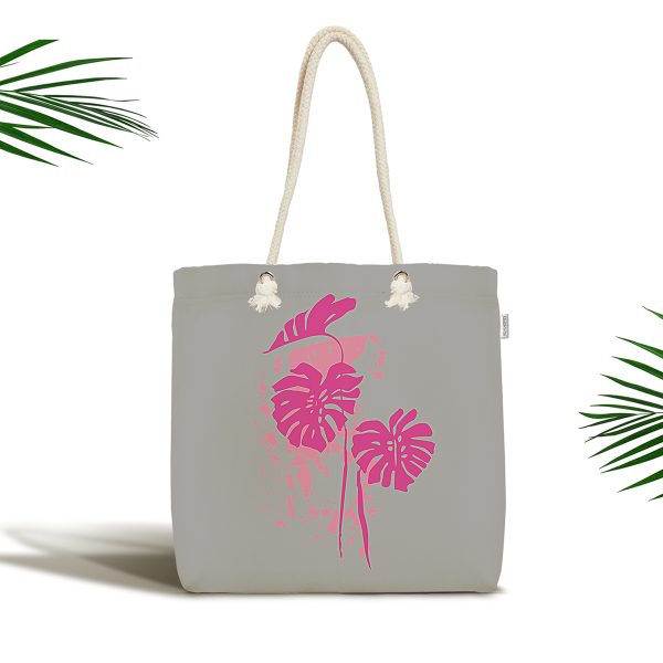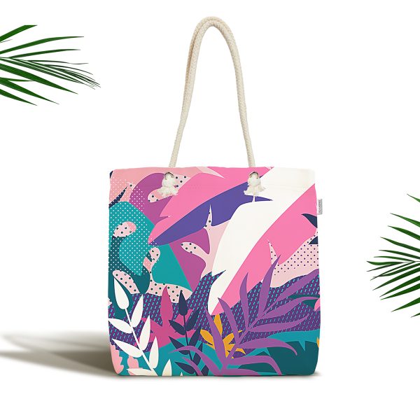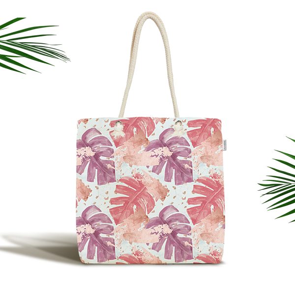 Pembe Tropik Yaprak Motifli Özel Tasarım Dijital Baskılı Kumaş Plaj Çantası