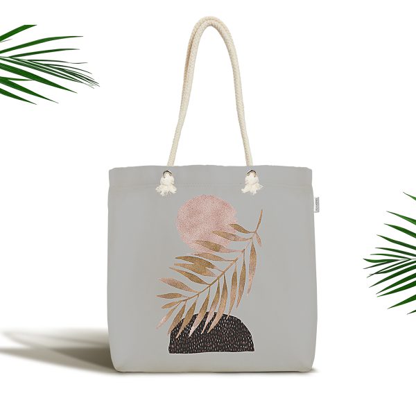 Gri Zeminde Palmiye Yaprakları Motifli Kumaş Plaj Çantası