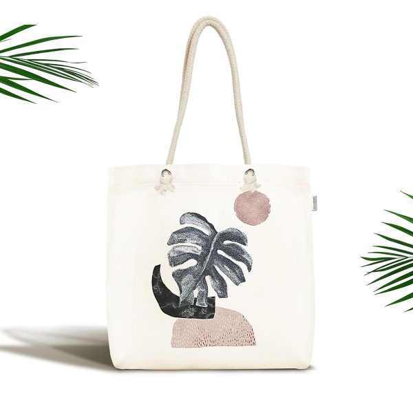 Sulu Boya Tropik Yaprak Desenli Özel Tasarım Modern Kumaş Plaj Çantası
