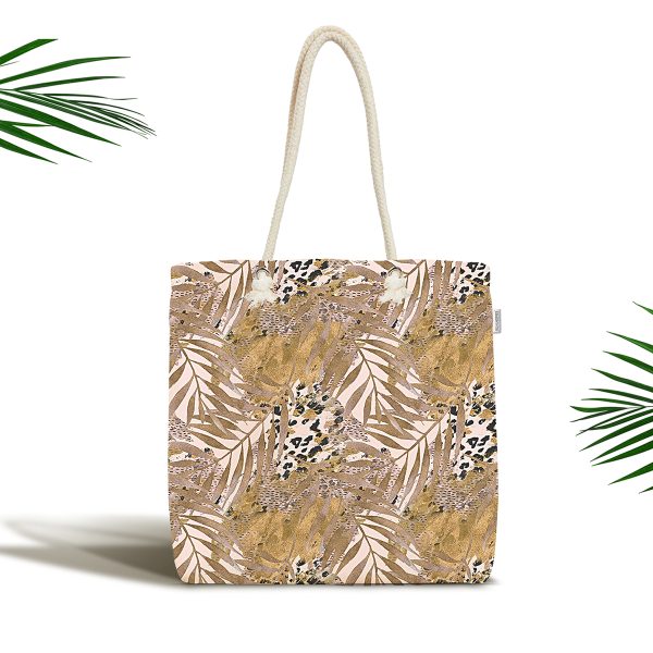 Leopar Temalı Kuru Yaprak Desenli Dijital Baskılı Kumaş Plaj Çantası