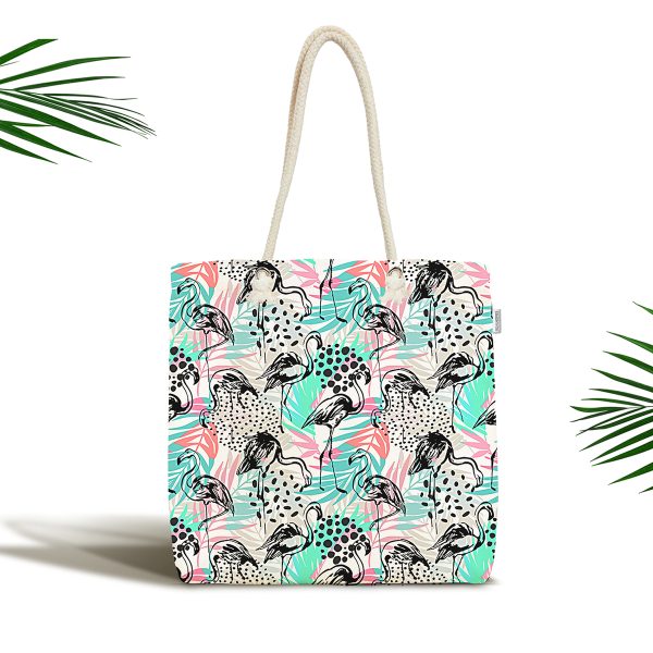 Renkli Yapraklar Üzerinde Flamingo Motifli Kumaş Plaj Çantası