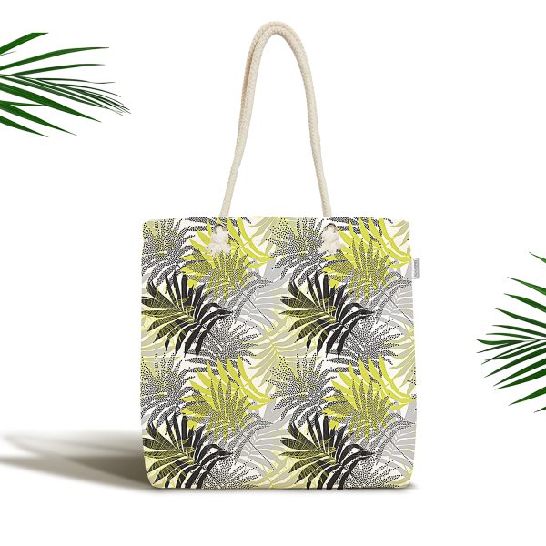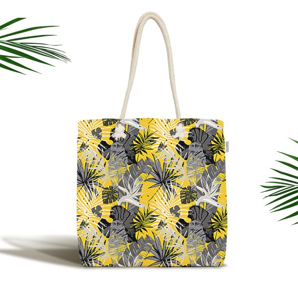 Sarı Zemin Üzerinde Beyaz Ve Gri Yaprak Motifli Kumaş Plaj Çantası