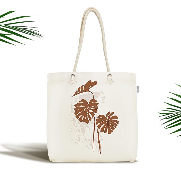 Beyaz Zeminde Tropik Yaprak Desen Dijital Baskılı Kumaş Plaj Çantası