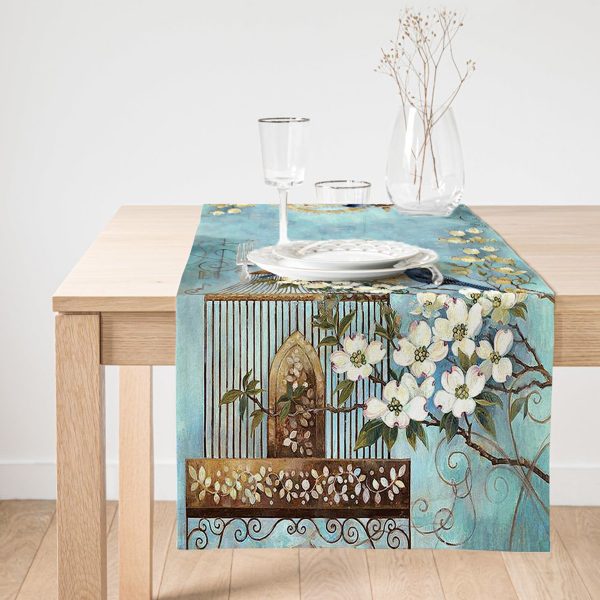 Realhomes Mavi Kuş Desen Dijital Baskılı Dekoratif Süet Runner
