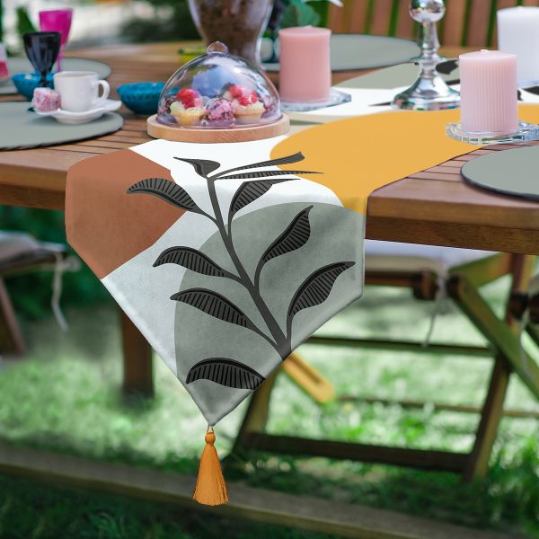 Realhomes Renkli Zeminli Onedraw Çizimli Yaprak Desenli Dijital Baskılı Özel Tasarım Püsküllü Şönil Üçgen Runner